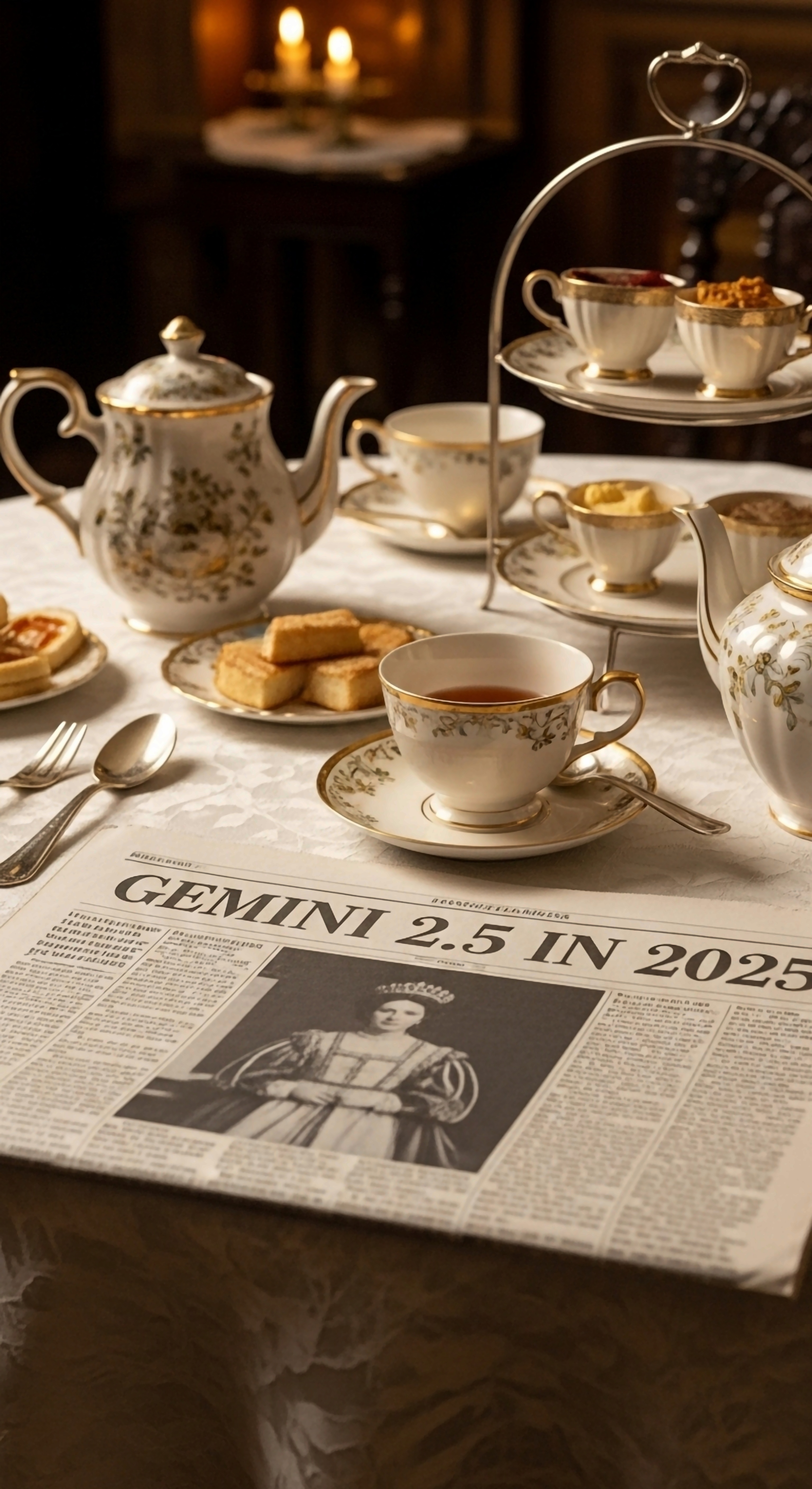 Indulge in a moment of refined elegance with this afternoon tea still life. Set with antique china, fresh pastries, and a newspaper, it evokes a feeling of quiet luxury and timeless tradition.