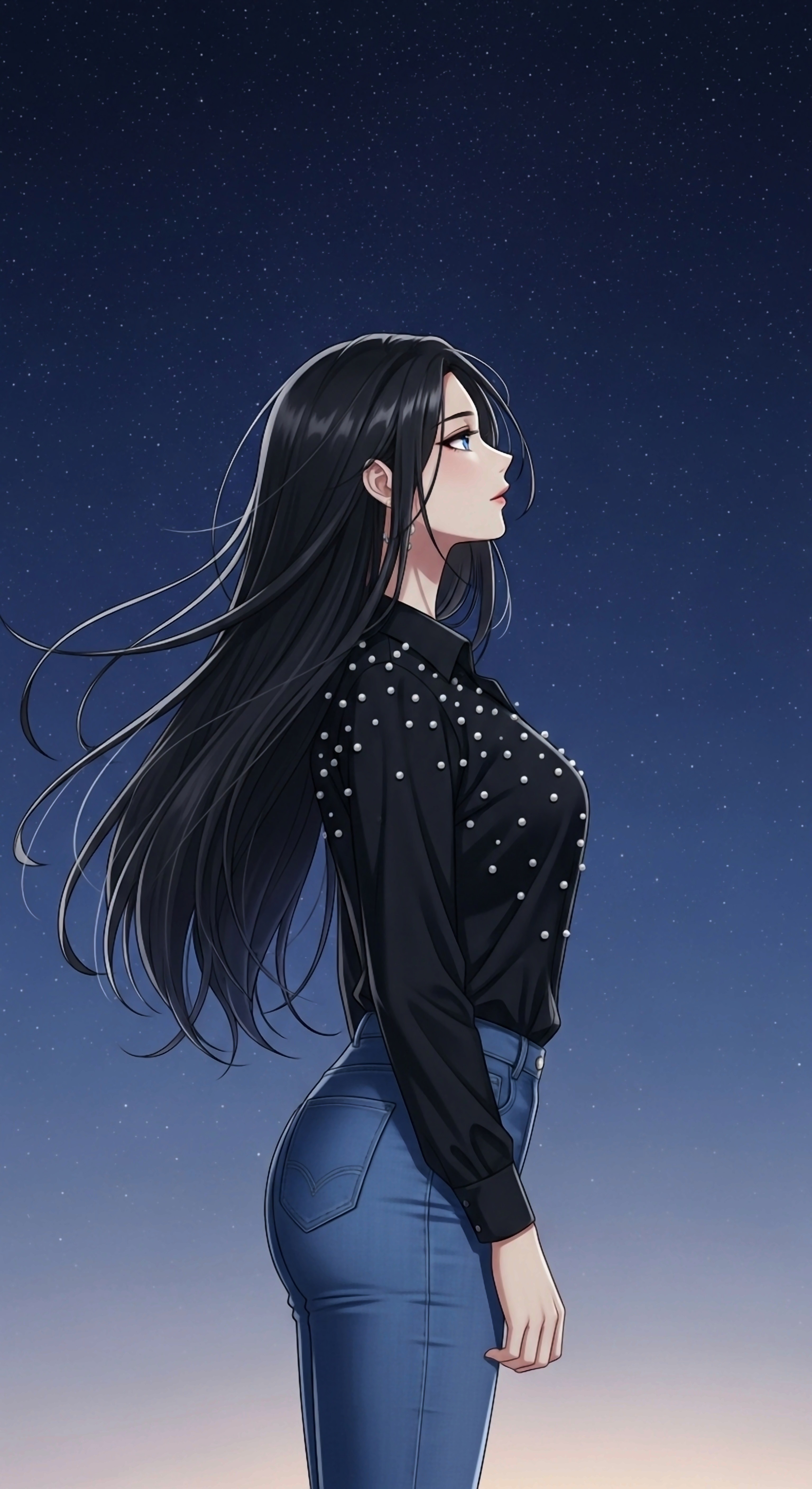 Lost in thought, a beautiful anime girl gazes at a mesmerizing night sky. The subtle colors and detailed character design create a serene and captivating wallpaper.