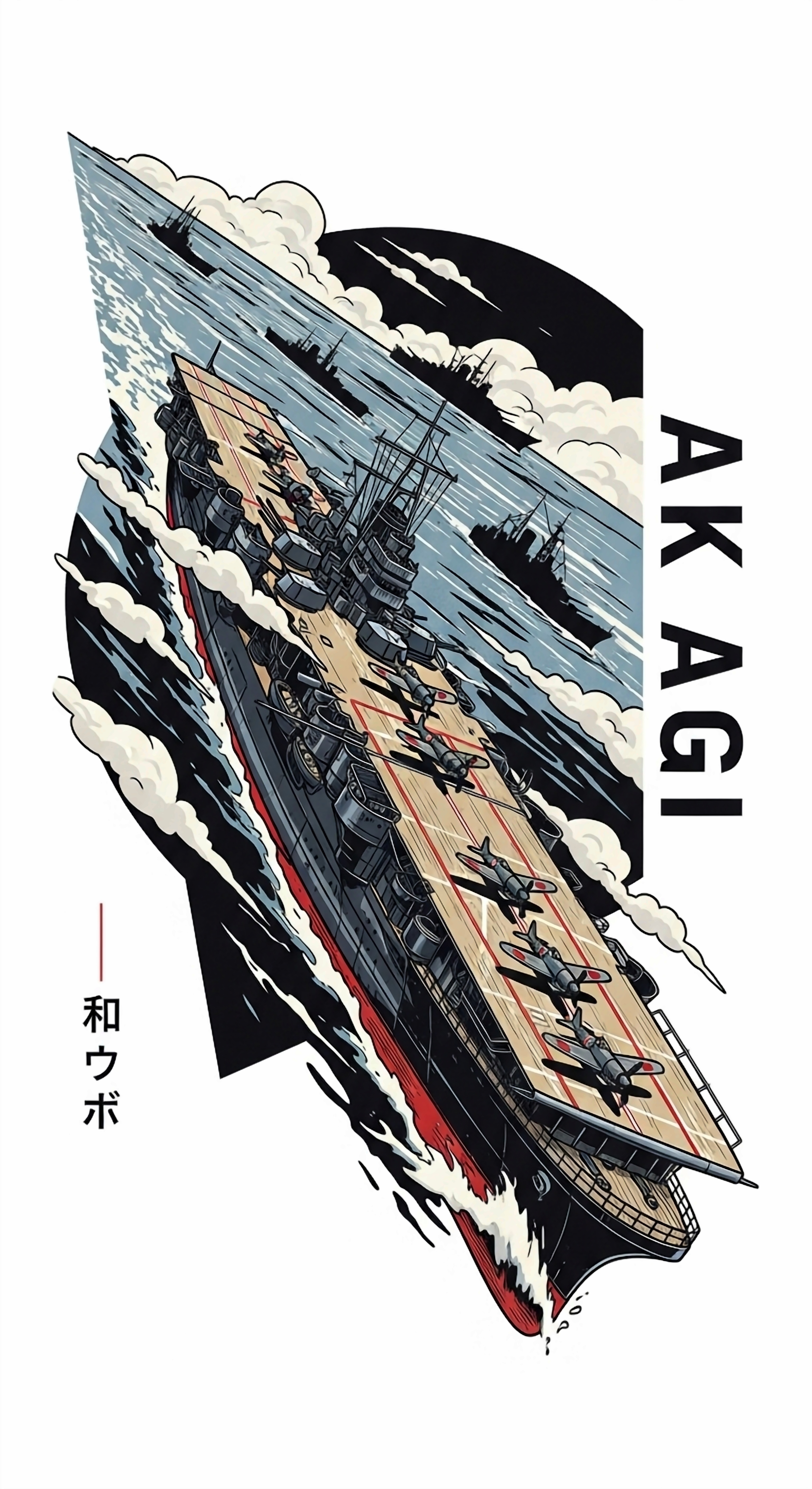 A striking illustration of the Akagi aircraft carrier at sea, rendered in a bold, graphic style. This wallpaper evokes a sense of historical power and naval strength. A unique piece for military history enthusiasts.