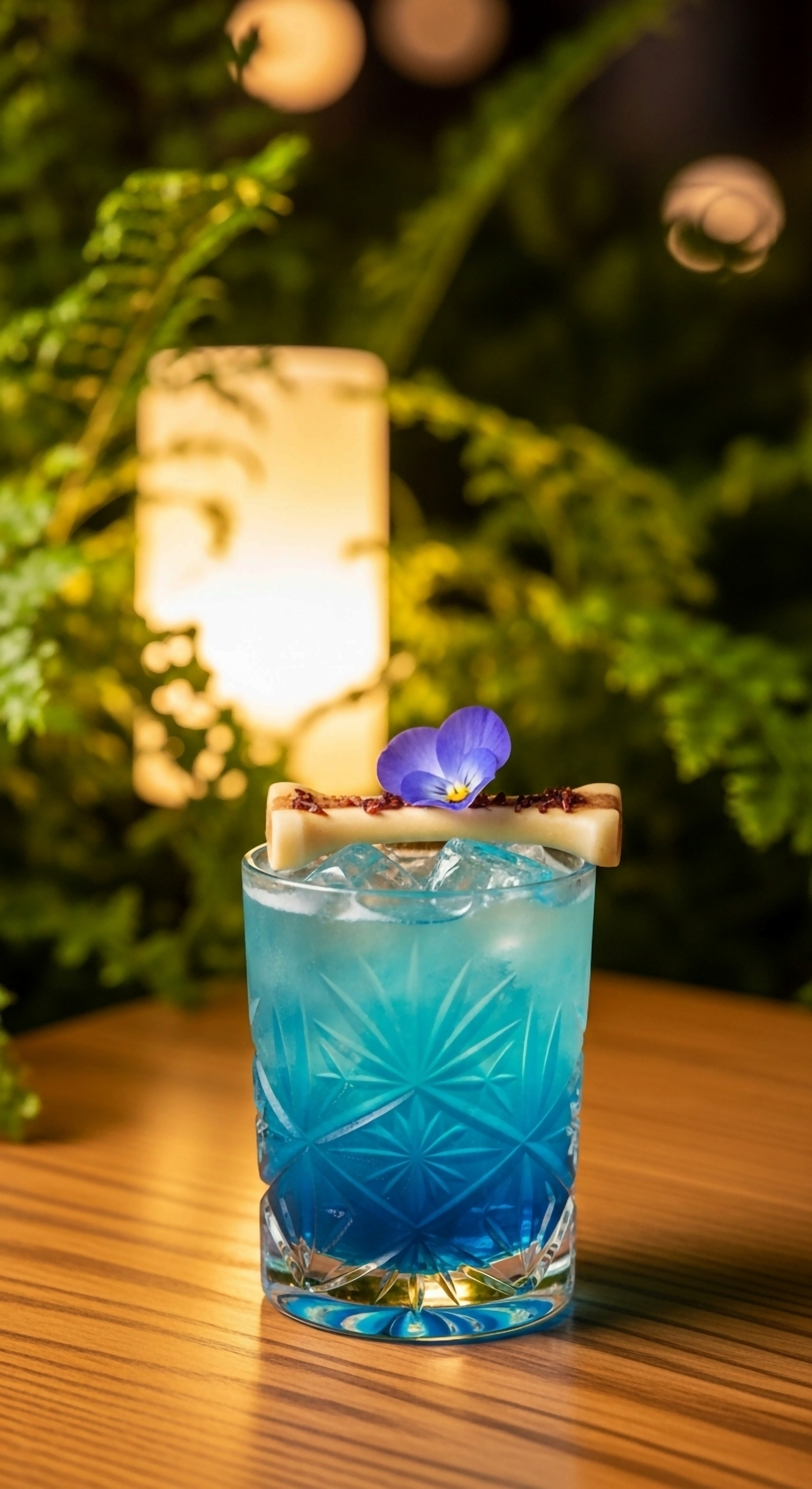 A vibrant blue cocktail sparkles in a cut crystal glass, adorned with a delicate purple flower. Enjoy the taste of summer with this delicious drink. Perfect for a relaxing evening.