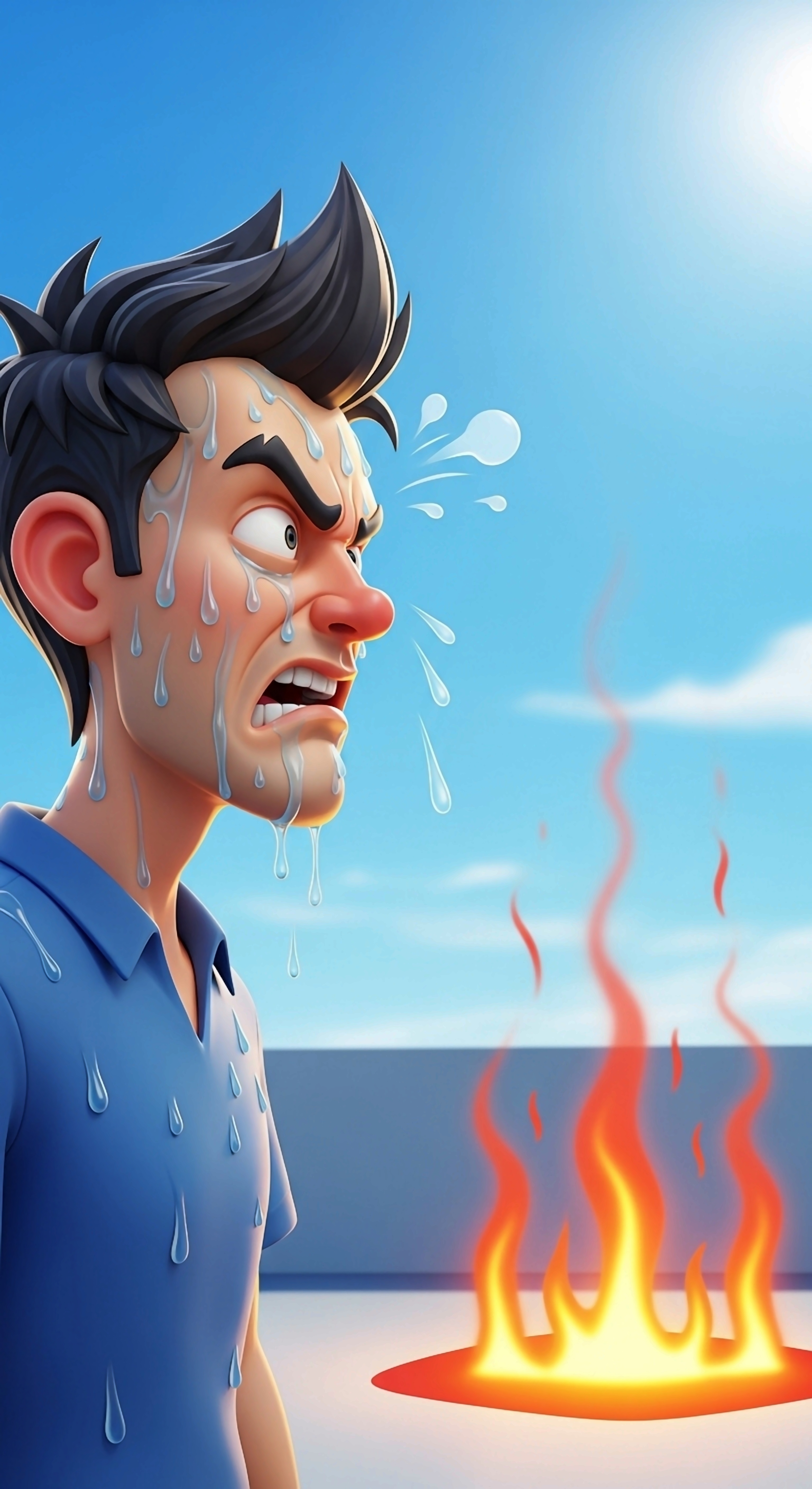 A cartoon man sweats profusely in extreme heat, with a fire visible. The image captures a humorous and exaggerated depiction of discomfort from high temperatures under a clear, bright sky.
