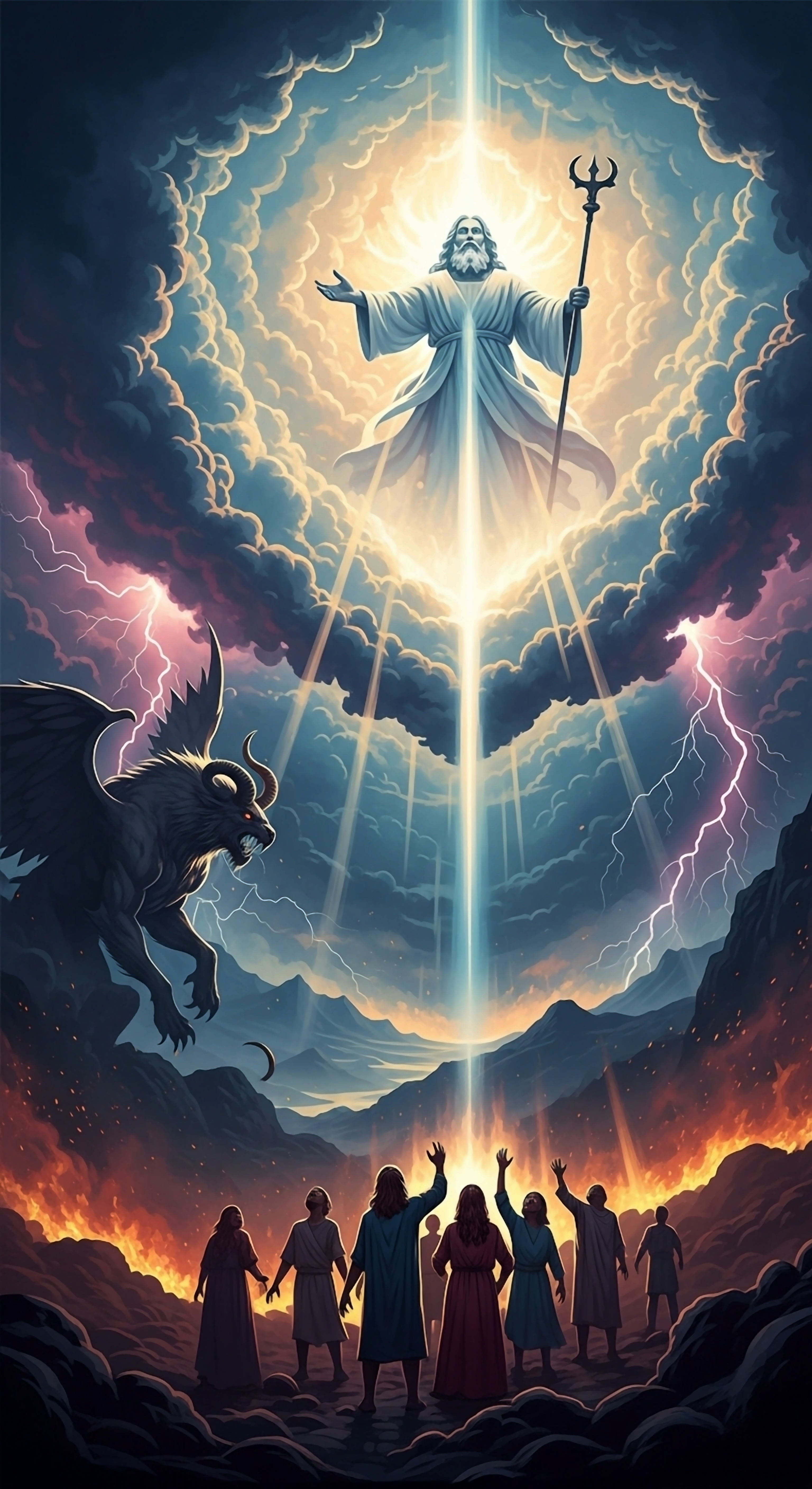 Witness a dramatic scene of divine power as a celestial figure descends amidst lightning and fire. A gathering of figures look up in awe, contrasting with the menacing winged beast.