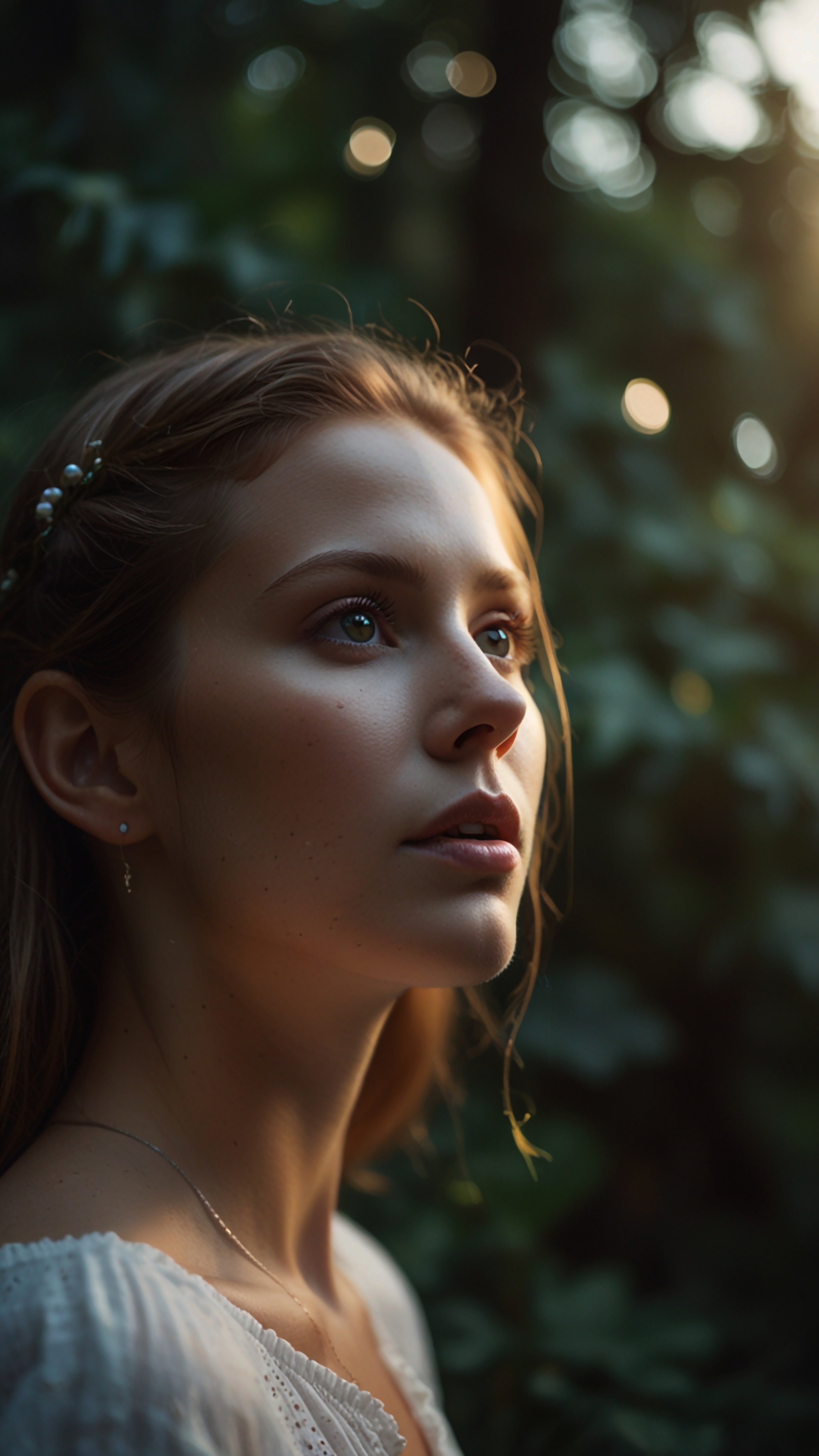 A serene portrait of a young woman illuminated by golden light, gazing upwards with a thoughtful expression. A calming, ethereal aesthetic ideal for a relaxing digital backdrop.