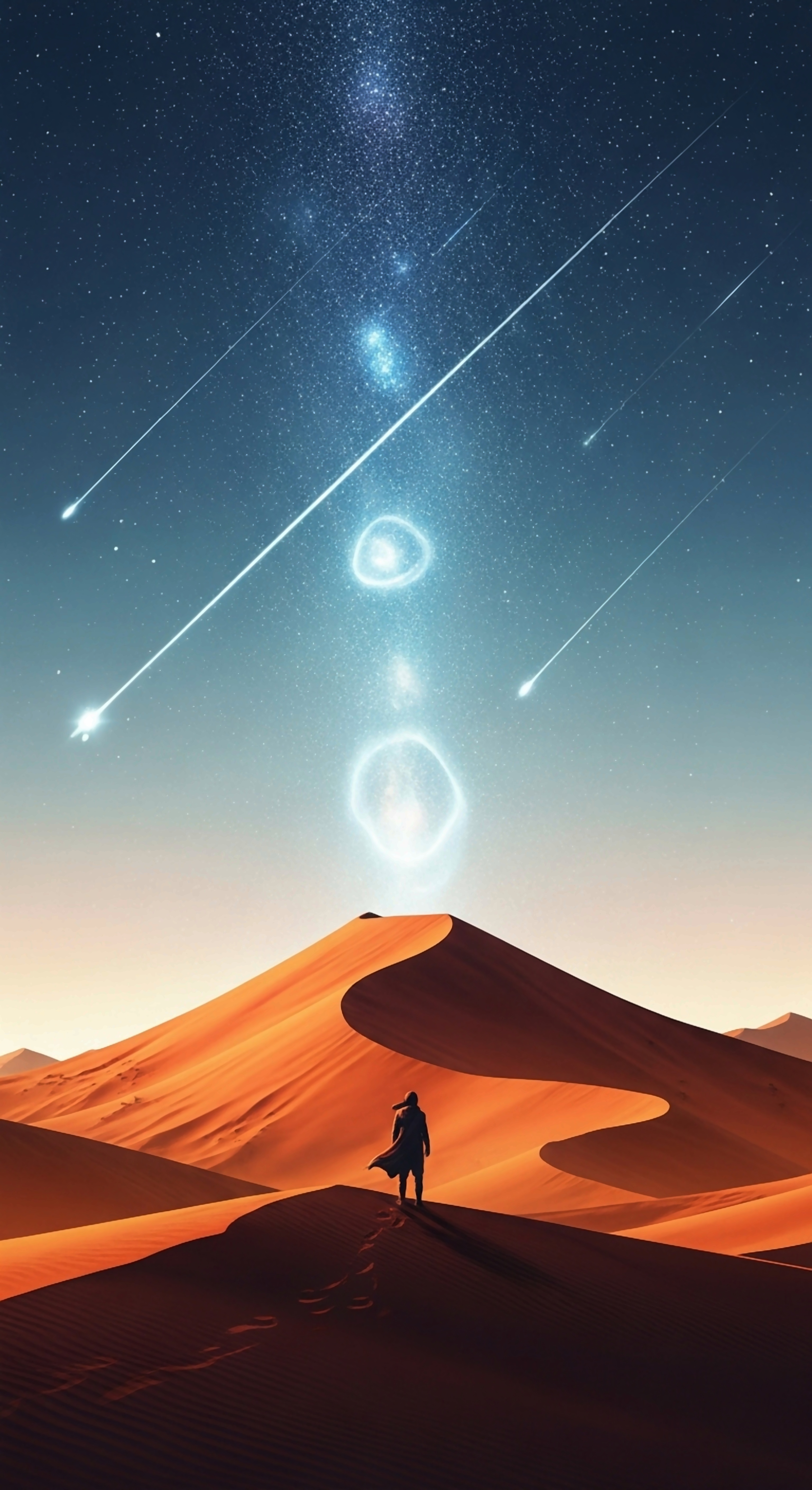 Gaze upon a lone figure silhouetted against a vast desert beneath a starlit sky. Shooting stars and ethereal lights illuminate the landscape, creating a sense of wonder and peaceful solitude. Perfect for dreaming.