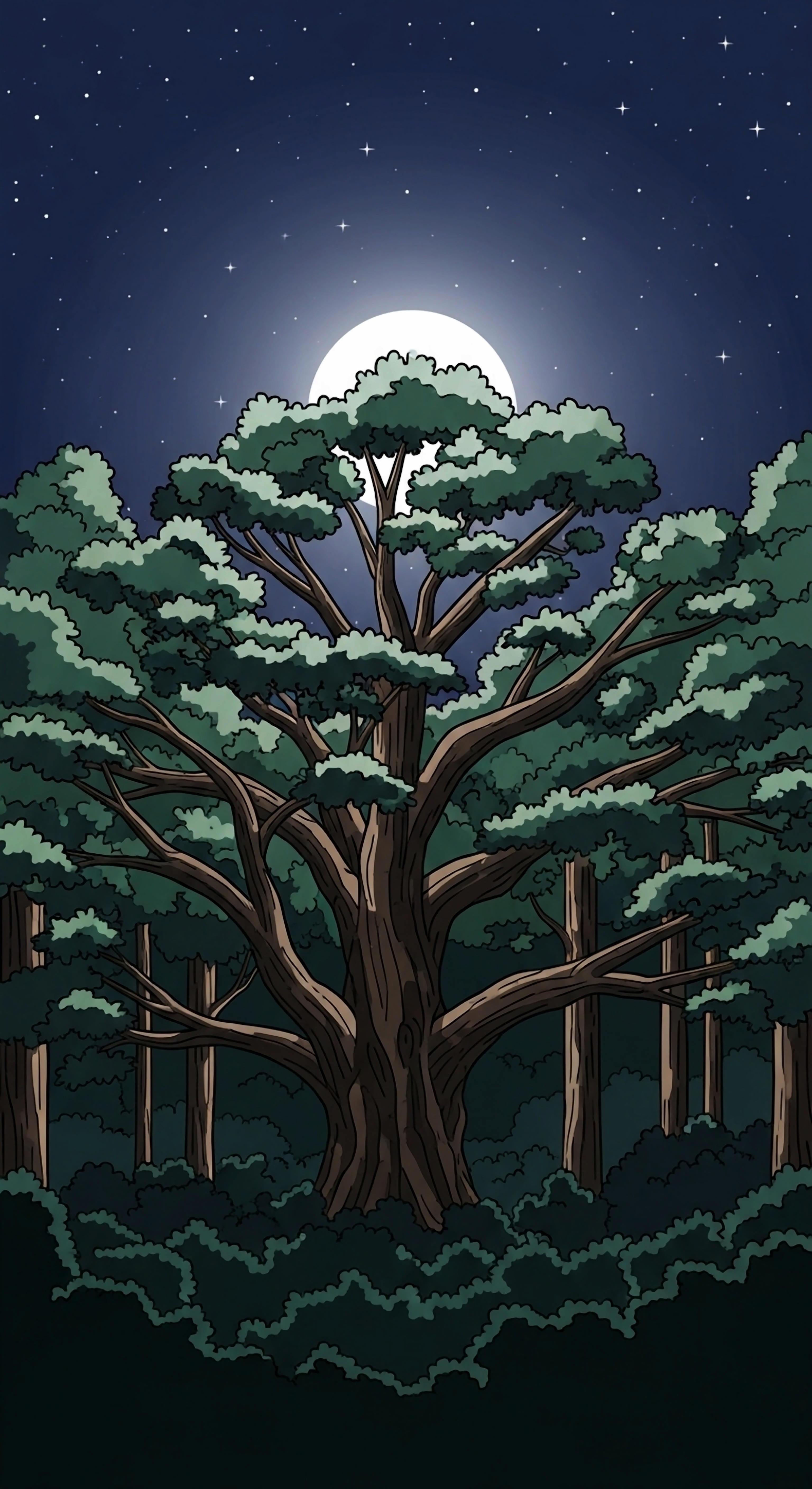 Escape into a serene night with this enchanted forest wallpaper. A grand tree stands beneath a luminous moon, creating a calming, mystical atmosphere perfect for your screen.