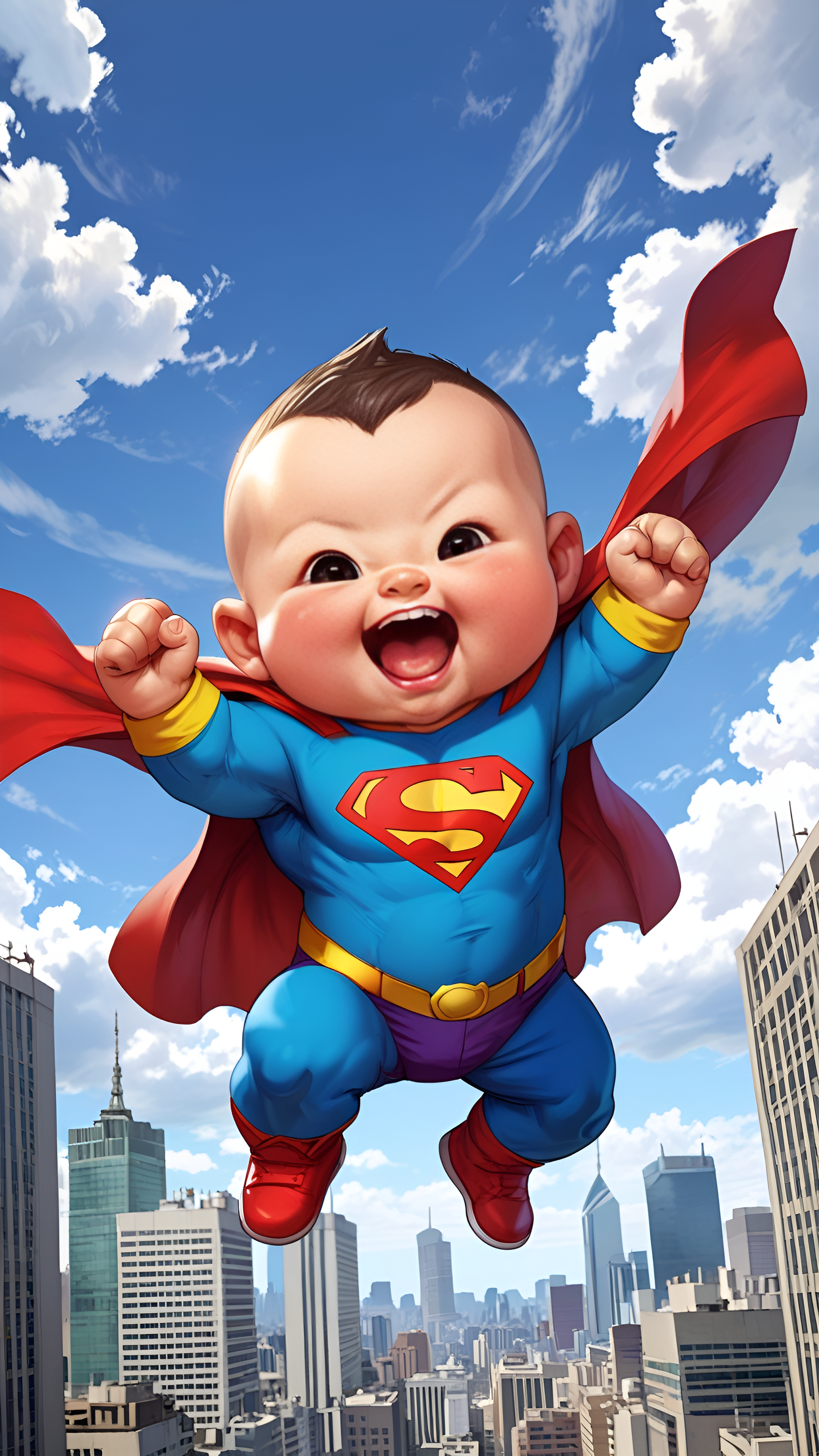 Meet the cutest superhero in this delightful wallpaper featuring a baby dressed as Superman soaring through a bright blue sky. With a playful expression and iconic cape, this whimsical design is perfect for fans of comics and families looking to add a touch of fun to their devices.
